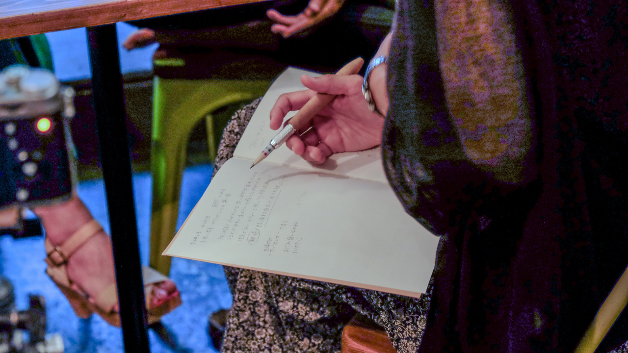 対談中はキーワードを書き収めるため、ノートに書き込み…